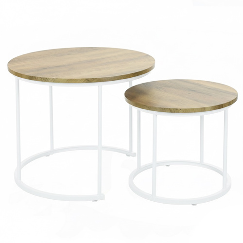 Zestaw stolików kawowych Belivio ALBA ROYAL OAK to duet, który łączy lekkość loftowego stylu z codzienną wygodą. Dwa okrągłe stoliki w naturalnym odcieniu dębu, wsparte na białym, stalowym stelażu, wprowadzają do wnętrza świeżość, harmonię i odrobinę industrialnego charakteru.